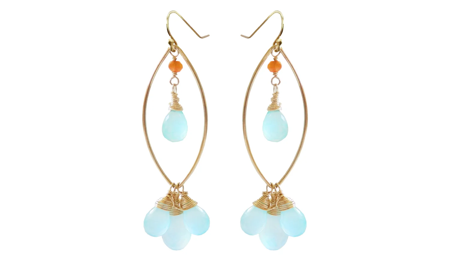 Larimar is such a rare and precious gem found only in the Dominican Republic. These incredible earrings feature smooth Larimar pendants crowned with hand wrapped Mandarin Garnet.